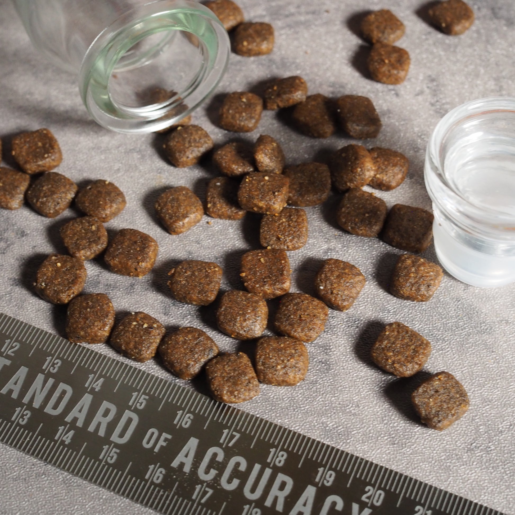 粗タンパク質 31%、粗脂肪 20%、粗灰分 9%、粗繊維 2.5%、水分 8%、オメガ6 2.5%、オメガ3 3%