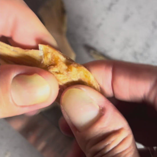 大きなヒレの形を生かしてカットされており、適度な噛み応えがあるため、長く噛むことで満足感を得やすく、歯の健康維持にも役立ちます。