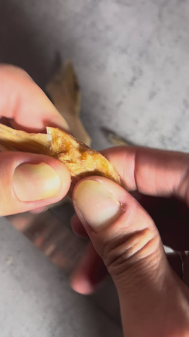 ヒレ部分には、身(フィレ)、皮、軟骨、そして天然のサーモンオイルが凝縮されており、これらすべてをフリーズドライ製法で加工することで、必須脂肪酸を含む貴重な栄養素をそのまま閉じ込めています。