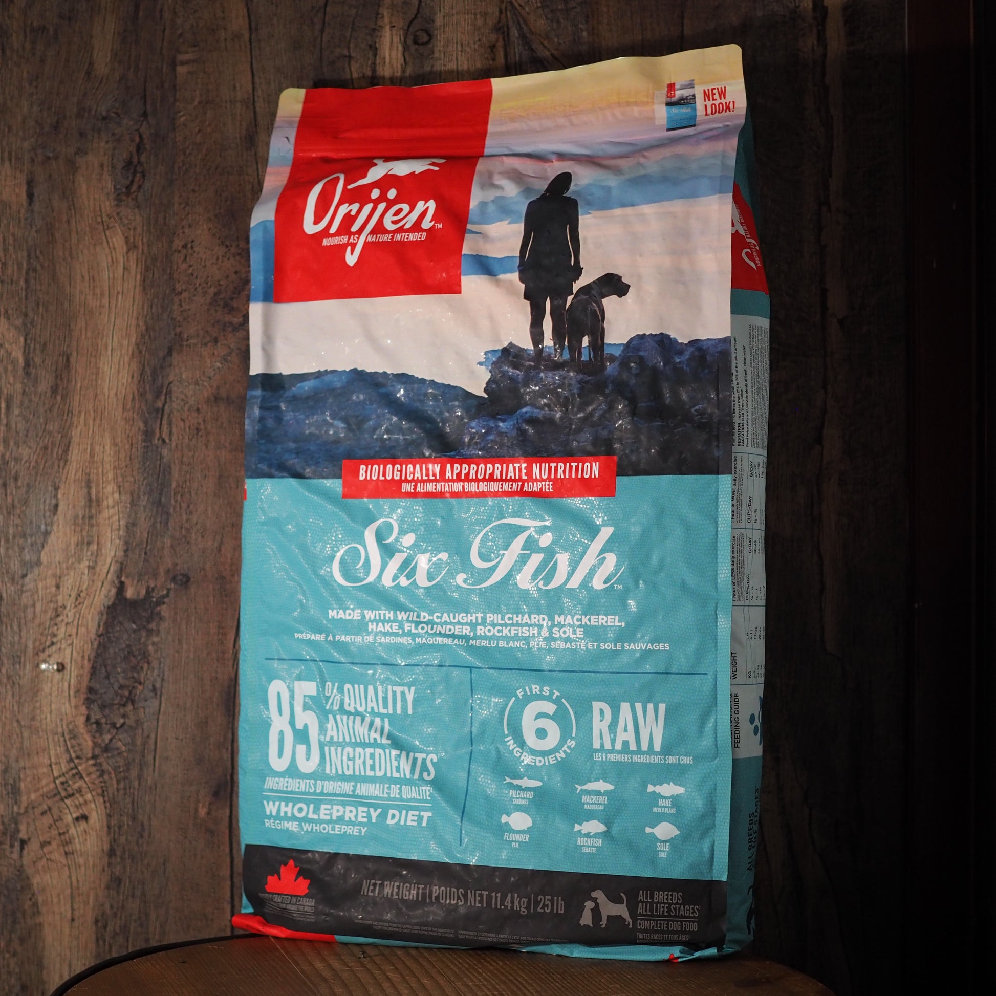 生の丸ごとイワシ(18%), 生の丸ごとサバ (11%), 生の丸ごとヘイク (10%), 生カレイ(6%), 生の丸ごとメバル (6%), 生の丸ごとシタビラメ (6%), ディハイドレートサバ (5%), ディハイドレートニシン (5%), ディハイドレート白身魚 (5%), ディハイドレートイワシ(5%), ディハイドレートアオギス (4%), ニシン油 (4%), 丸ごと赤レンズ豆, 丸ごとエンドウ豆, 丸ごとヒヨコ豆, 丸ごと緑レンズ豆, レンズ豆繊維, 丸ごとピント豆, エンドウ豆スターチ, ヒマワリ油, 乾燥ケルプ, 新鮮丸ごとカボチャ, 新鮮丸ごとバターナッツスクワッシュ, 新鮮丸ごとズッキーニ, 新鮮丸ごとニンジン, 新鮮丸ごとリンゴ, 新鮮丸ごと洋梨, 乾燥チコリールート, 新鮮ケール, 新鮮ホウレン草, 新鮮ビートの葉, 新鮮カブラ菜, 丸ごとクランベリー, 丸ごとブルーベリー, 丸ごとサスカトゥーンベリー, ターメリック, オオアザミ, ゴボウ, ラベンダー, マシュマロルート, ローズヒップ. 酸化防止剤: 植物油から抽出したトコフェロール: 121mg, クエン酸: 40mg. ローズマリーエキス: 80mg. 添加栄養素(1kgあたり): 3b606 (亜鉛: 75mg), 3b406 (銅: 11mg), 3a821 ビタミン B1: 9.8mg, 3a700 ビタミン E: 200 IU. 添加腸球菌: 4b1707 エンテロコッカスフェシウム菌 NCIMB 10415 1x10^9 CFU.