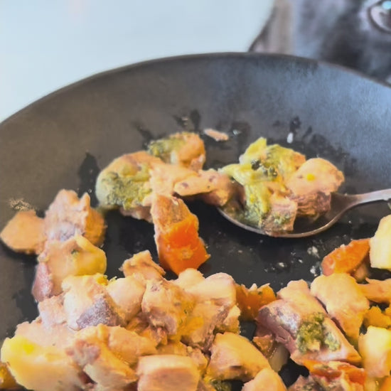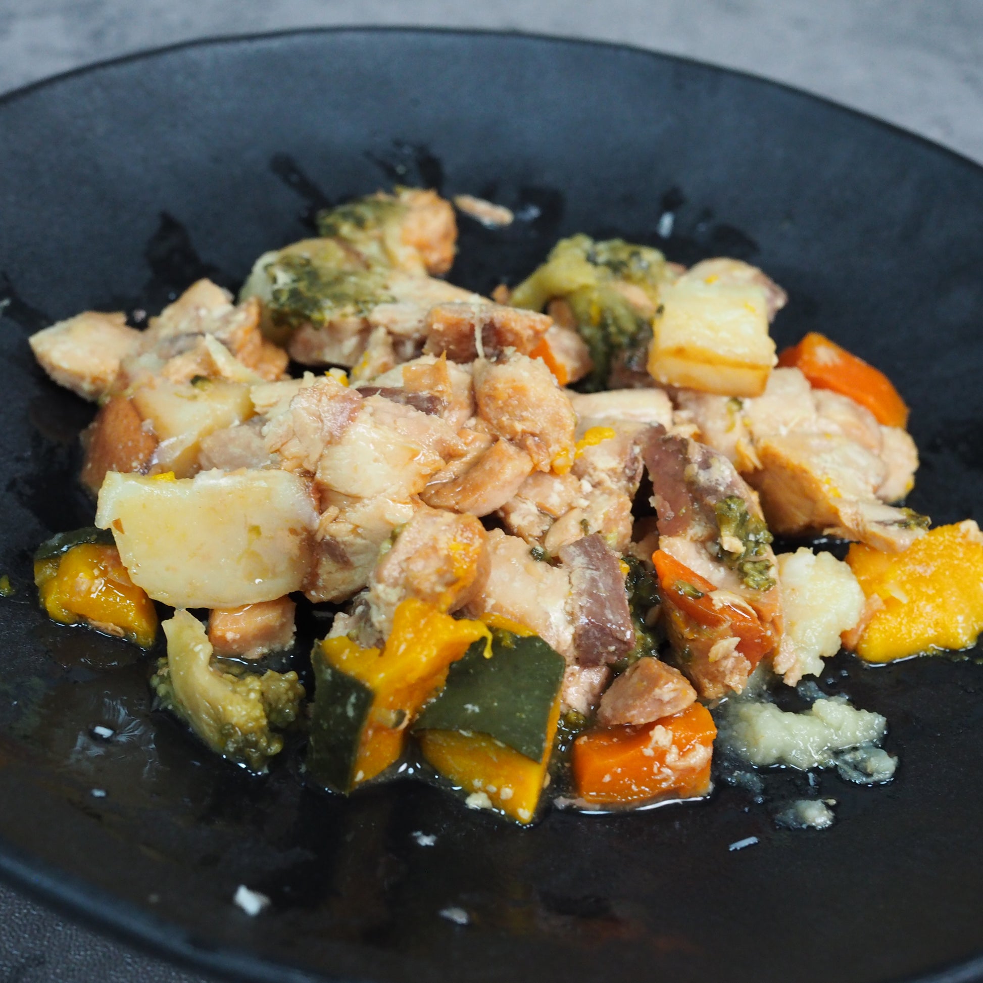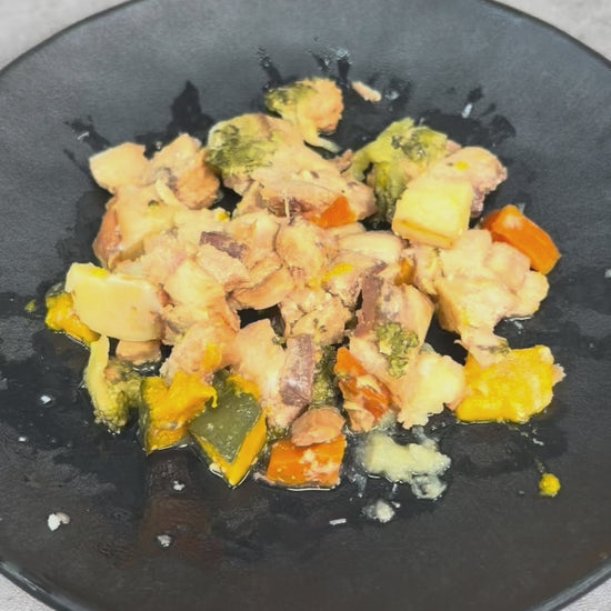 高タンパク・低脂肪な天然ブリの身と、人参、カボチャ、さつまいも、ブロッコリーが、バランスよく栄養を届けます。
