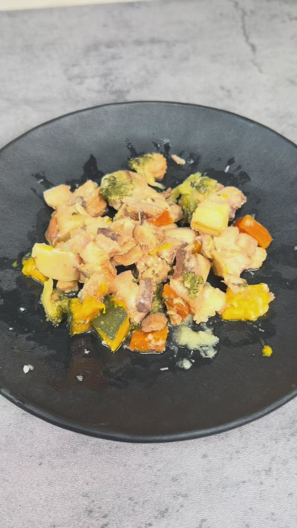 高タンパク・低脂肪な天然ブリを主原料に、人参、カボチャ、さつまいも、ブロッコリーという4種類の緑黄色野菜をダイスカットにしてたっぷり配合。